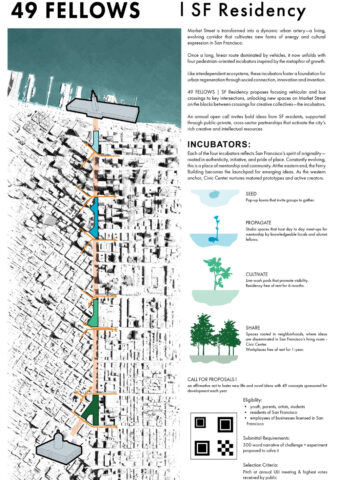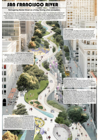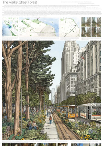 The jury struggled to find what could be thought of as a powerful massive greening idea. While many submissions incorporated greenery at scale, few engaged deeply with the unique context and ecology of Market Street. This idea stands out for doing just that—albeit in a polemical way that, realistically, would take generations to realize (and might ultimately involve species other than redwoods). Jurors appreciated the dense tree planting and pedestrian-focused approach, noting that an investment in big trees on day one would be critical to its success. That’s okay: this proposal doesn’t prescribe a specific landscape so much as it reveals a forest that has been waiting to emerge.