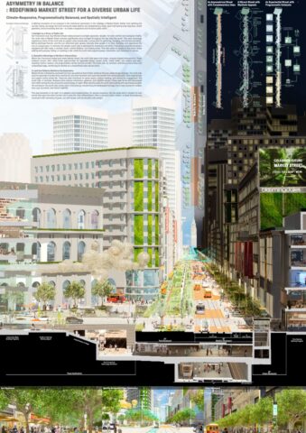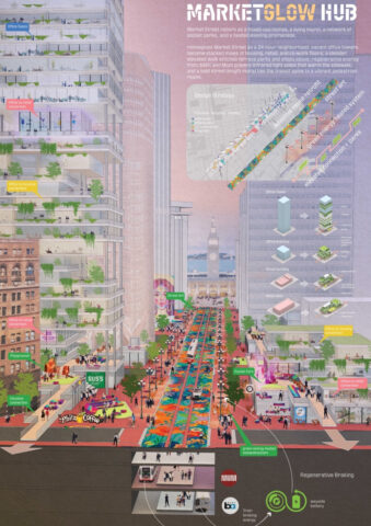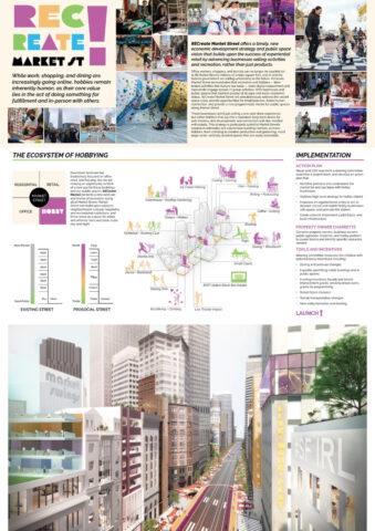 The jury acknowledged Market Street’s strength as a transit-rich zone and its visual power as a centerpiece of the city. But today’s reality can feel more like a troubled void due to empty office space and retail storefronts. While other areas of the city are thriving due to neighborhood scale and a mix of uses, Market Street lacks compelling reasons to gather or explore.The six ideas selected as winners all address these challenges in different — but complementary — ways.