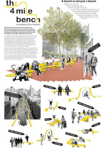 The jury is asking us to use our imaginations on this one. This idea is a critique of how few places there are to sit, rest, or pause along Market Street by proposing a unifying element. It doubles down on a joyful gesture that runs counter to most current approaches to public space by adding, not removing, places to relax. It creates a critical mass of seating that invites all people to engage in the grandeur and vibrancy of Market Street. Should it be yellow or look like this – remember, it’s an idea, not yet a design.