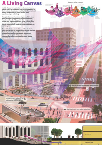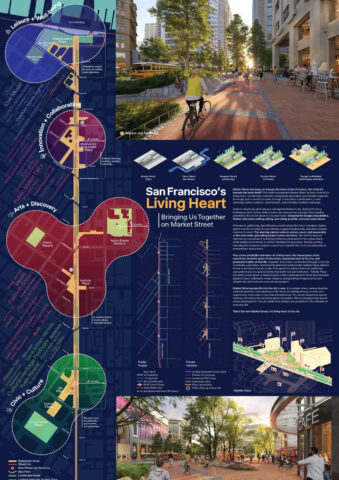 There were multiple entries that used strategies to amplify the nodes or activity zones that already exist in some form but enhancing them in smart ways. The jury felt this entry best described a workable strategy. It imagines Market Street not just as a place you pass through because of its excellent transit, but as the heart of the city itself. It invests in four nodes by better integrating transit and ecology, designing for flexibility, creating more places for people, and strengthening the connections of these four areas to their adjacent areas off Market Street.