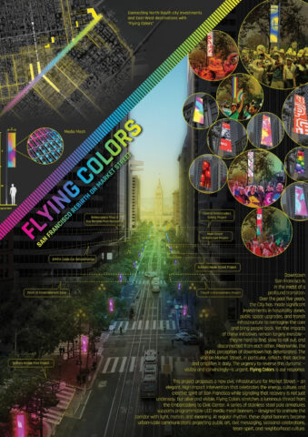 In addition to ideas that addressed the big structural challenges of Market Street, the jury was also looking for some ideas that could happen quickly and relatively inexpensively. This idea takes the notion of traditional light pole banners and puts a technology and wayfinding twist on them. Instead of fabric, these digital media mesh banners also light up at night and connect the dots for all the activities, events and venues along and adjacent to Market Street.