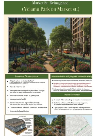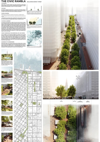 “I selected Market Street Reimagined (Yelamu Park on Market Street) because it proposes one simple but effective design concept that could, with development, be capable of relatively quick application. A central reservation of landscape, trees, gardens, pedestrian and bicycle routes could form a mini Las Ramblas along Market Street. It would be even better if the tree canopies touched to form a true and traditional avenue of trees (visually stronger and providing more valuable shade and absorption of CO2 to improve air quality). Along with other strategies of mixed uses (proposed by several selected entries), it has the potential to help regenerate Market Street.”