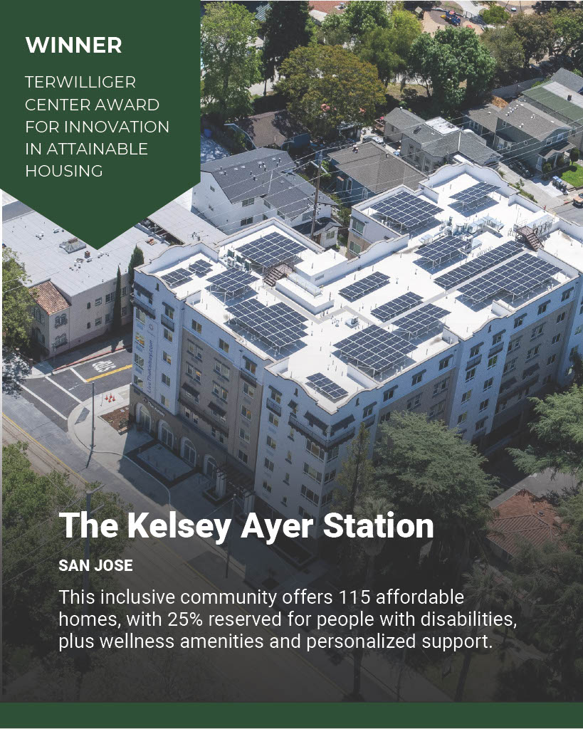 ULI SF is thrilled to share that a Bay Area project, The Kelsey Ayer Station in San José, won one of three Terwilliger Center Awards for Innovation in Attainable Housing. Kelsey Ayer Station includes 115 apartments for residents earning 20% to 80% of AMI, with 25% of units reserved for people with disabilities. Designed for cross-disability access and inclusive community living, the $75 million development features amenities such as a sensory garden, craft space, fitness room, dog run, and wellness terrace. On-site Inclusion Concierge staff offer personalized support, resource referrals, and relationship-building among residents.